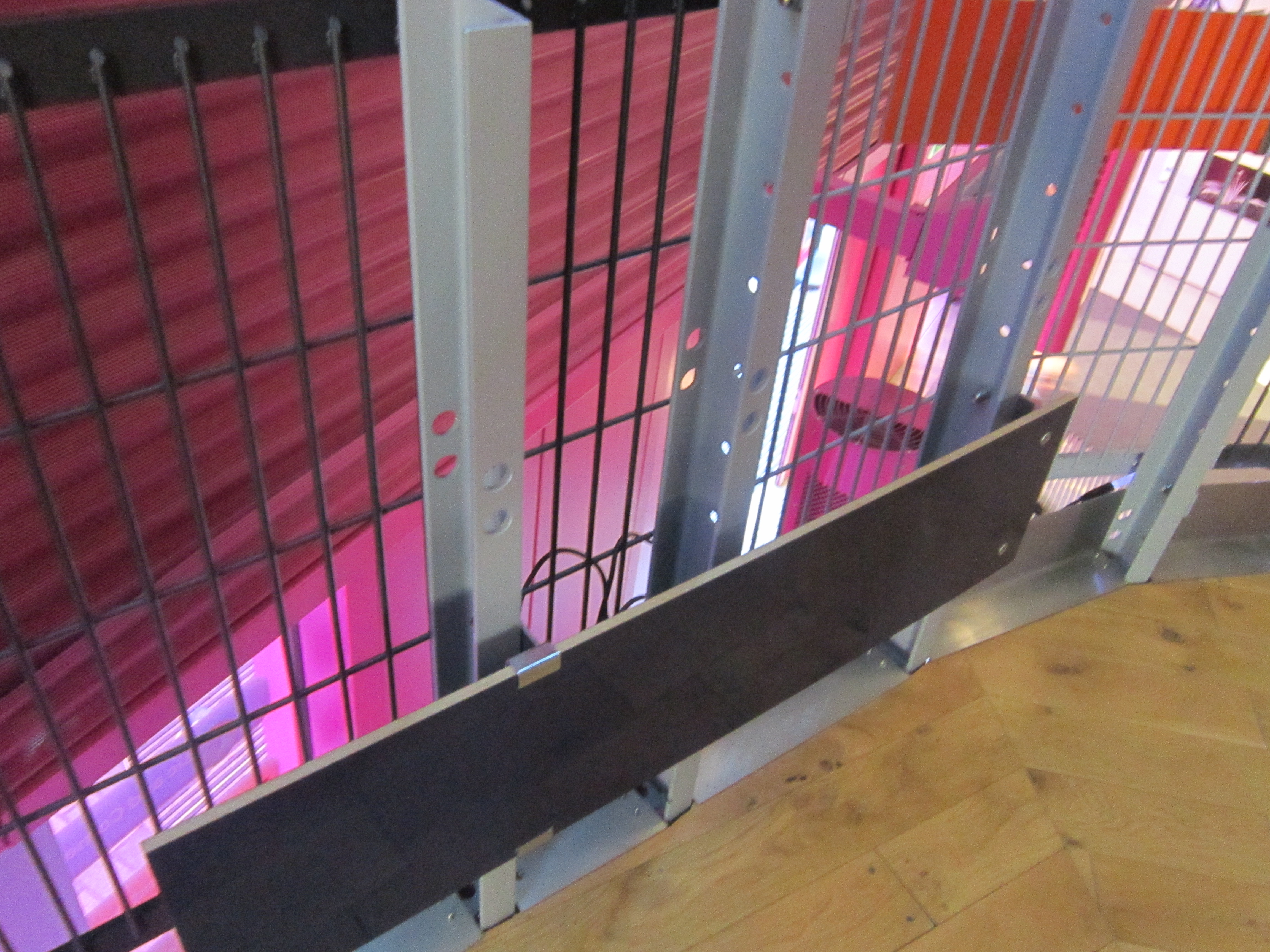 The laminated timber plank already has a bespoke finish and would hide the caged balustrade from behind for the display.