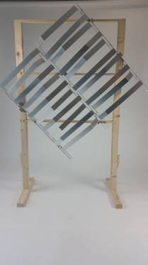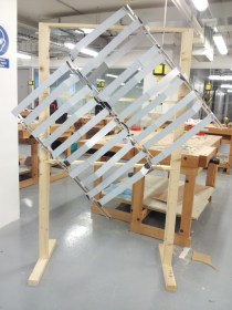 After we finished bolting the strips on the wood frame, we peeled the protection off and finalized the project concept. It came out to be very shiny and to reflect the day light, and sun light when available, exactly the